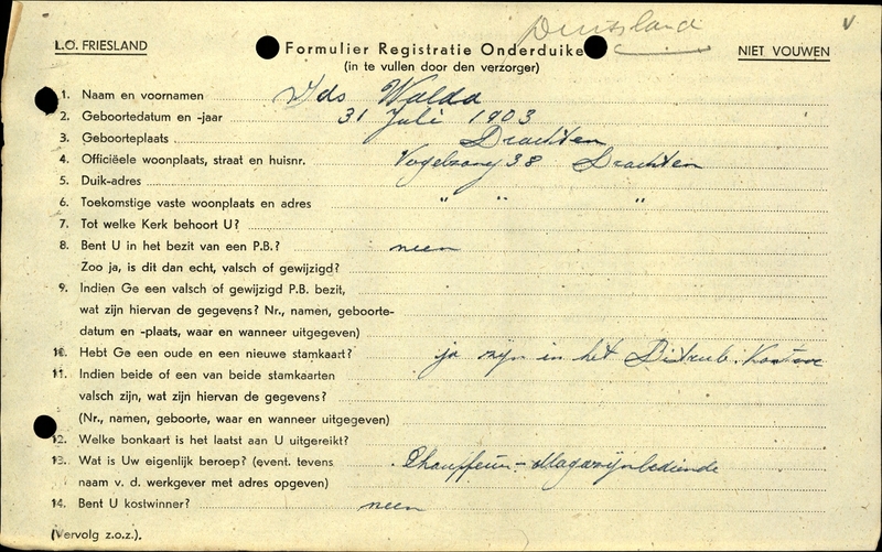 Duikadres: Vogelzang 38, Drachten - Oorspronkelijk adres: Vogelzang 38, Drachten - Reden onderduik: anderszins