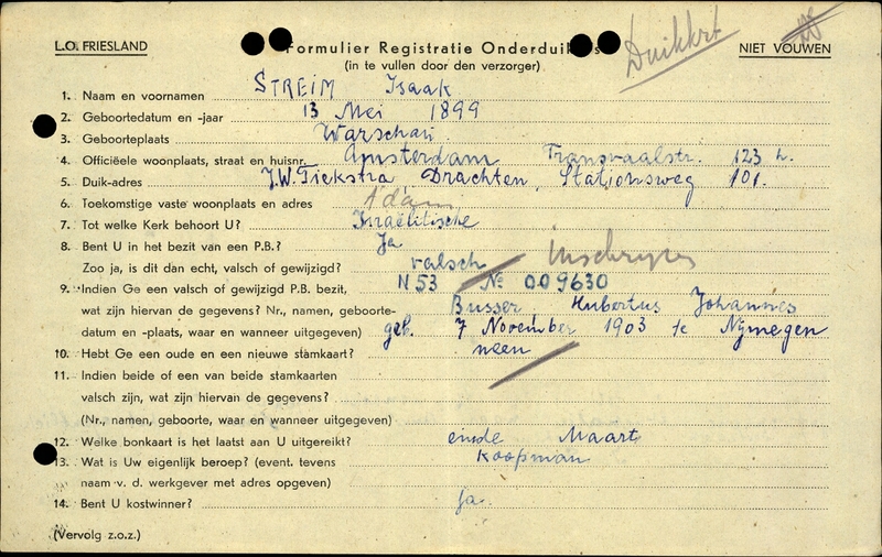 Duikadres: Stationsweg 101, Drachten - Oorspronkelijk adres: Transvaalstraat 123h, Amsterdam - Reden onderduik: jodenvervolging
