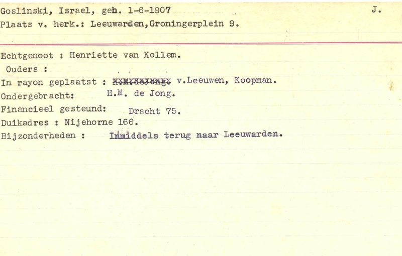 Duikadres: 166, Nieuwehorne - Oorspronkelijk adres: Groningerplein 9, Leeuwarden - Overige opmerkingen: Bijzonderheden: Inmiddels terug naar Leeuwarden -