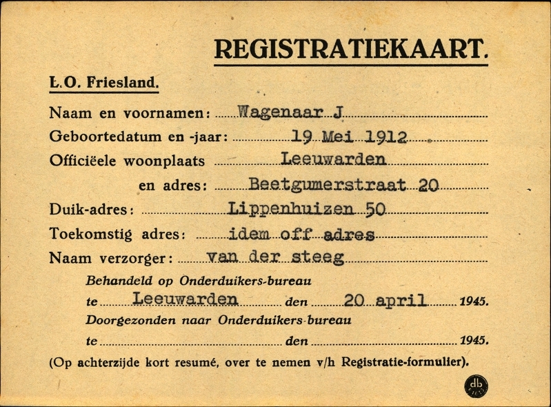 Duikadres: 50, Lippenhuizen - Oorspronkelijk adres: Beetgumerstraat 20, Leeuwarden - Reden onderduik: illegaal werk - Overige opmerkingen: Achterkant beroep: opz. rijkswaterstaat