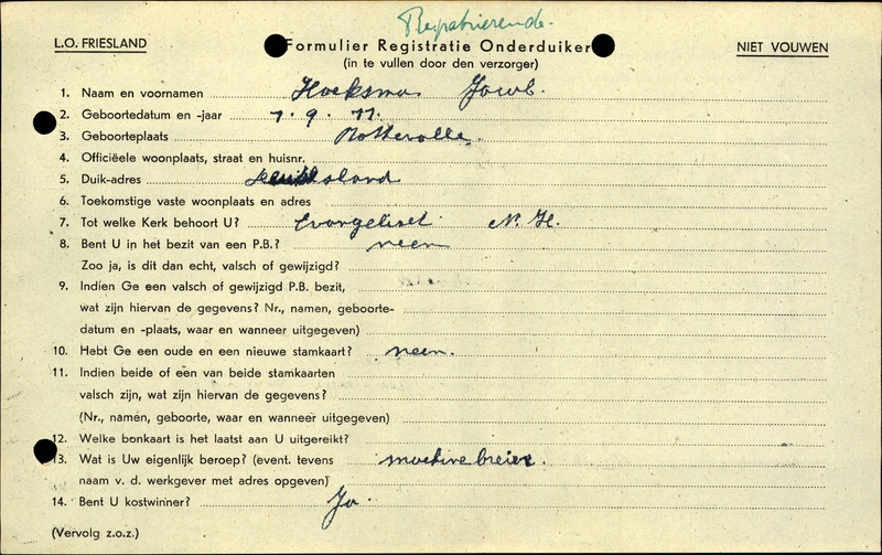 Duikadres: Duitsland - Reden onderduik: anderszins - Overige opmerkingen: Bijzondere opmerkingen: Bij kerkgenootschap staat ook nog N.H..
