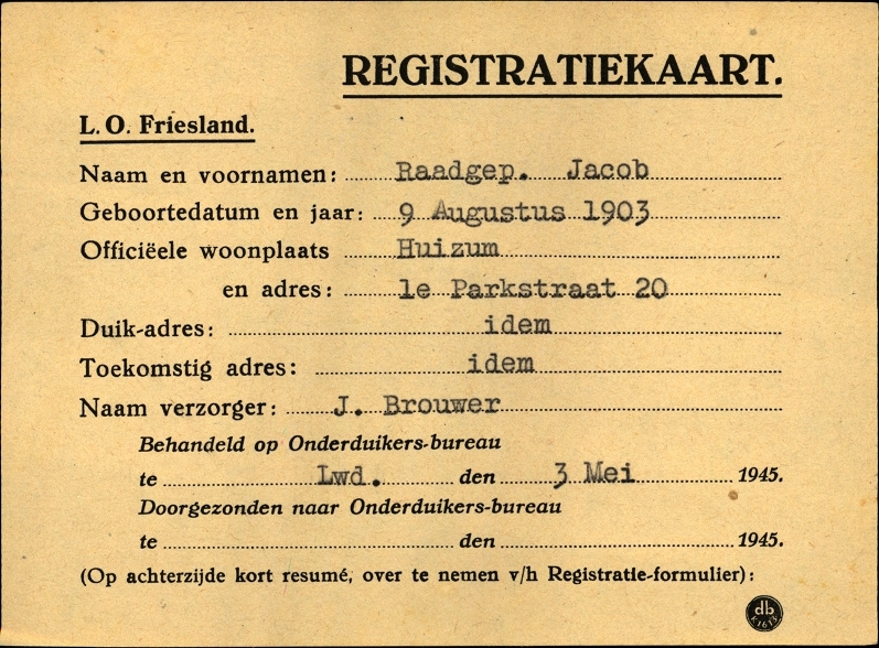 Duikadres: 1e Parkstraat 20, Huizum - Oorspronkelijk adres: 1e Parkstraat 20, Huizum - Reden onderduik: arbeidsinzet - Overige opmerkingen: Achterkant beroep: kellner