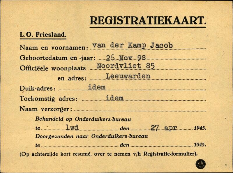 Onderduikregistratie van Jacob van der Kamp