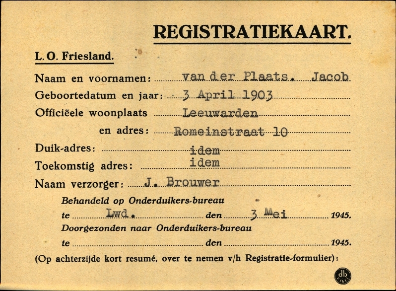 Duikadres: Romeinstraat 10, Leeuwarden - Oorspronkelijk adres: Romeinstraat 10, Leeuwarden - Reden onderduik: arbeidsinzet - Overige opmerkingen: Achterkant bijzonderheden: gevlucht uit Drente. Geen P.B. Stkrt? - Achterkant beroep: electricien