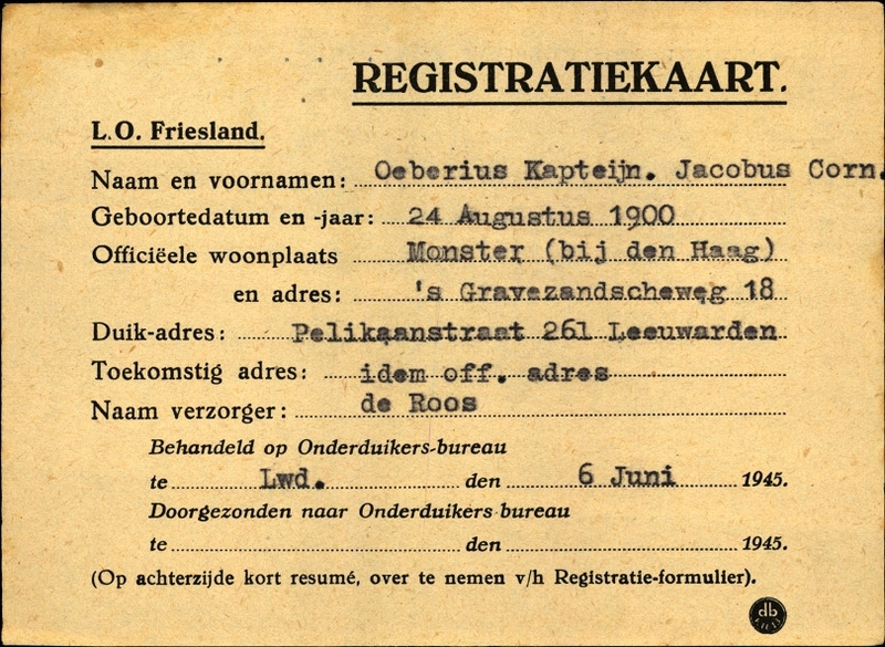 Onderduikregistratie van Jacobus Corn. Oeberius Kapteijn