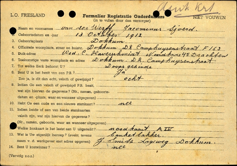 Onderduikinschrijving van Jacominus Sjoerd van der Werff