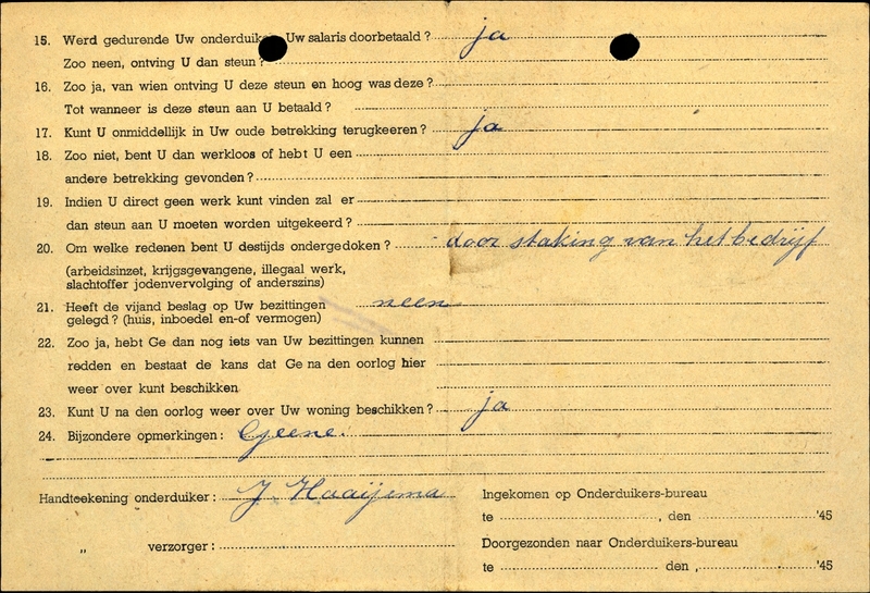 Onderduikinschrijving van Jan Haaijema