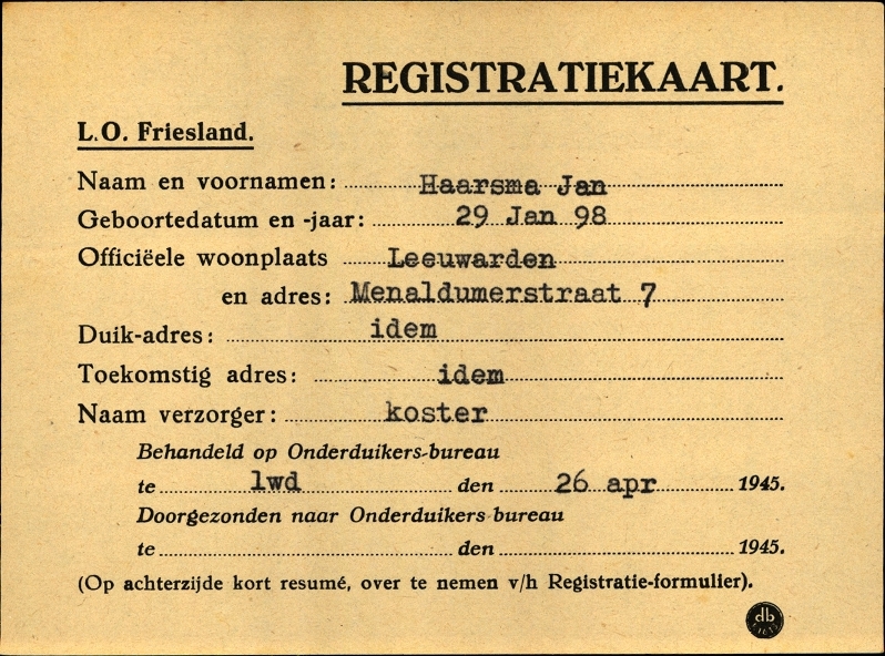 Duikadres: Menaldumerstraat 7, Leeuwarden - Oorspronkelijk adres: Menaldumerstraat 7, Leeuwarden - Reden onderduik: arbeidsinzet - Overige opmerkingen: Achterkant beroep: Kruidenier - Achterkant naam werkgever: -