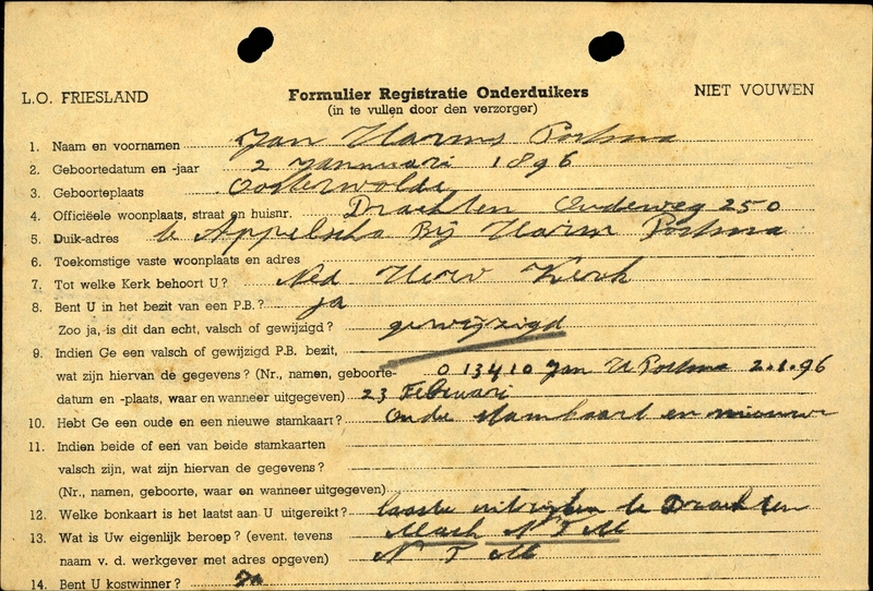 Duikadres: Appelscha - Oorspronkelijk adres: Oudeweg 250, Drachten - Reden onderduik: staking