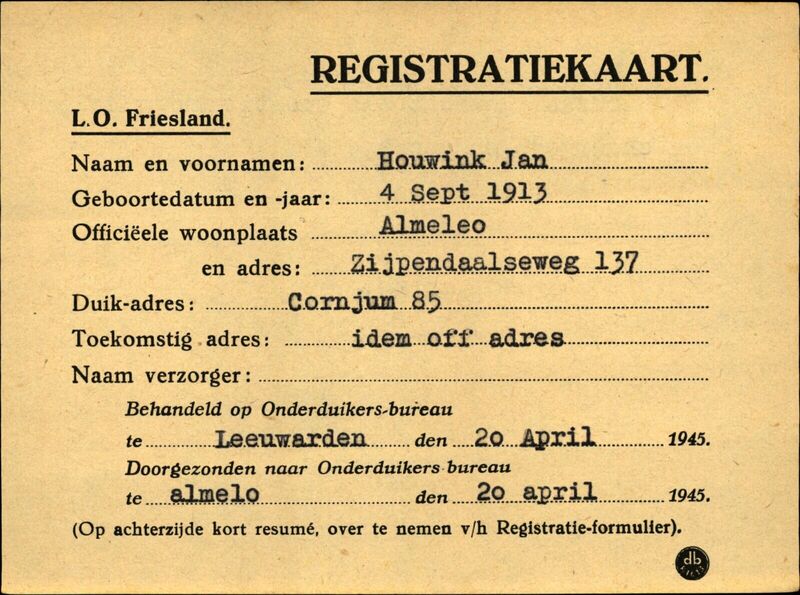 Duikadres: 85, Kornjum - Oorspronkelijk adres: Zijpendaalseweg 137, Almelo - Reden onderduik: arbeidsinzet - Overige opmerkingen: Achterkant beroep: Substituut griffier - Achterkant naam werkgever: -