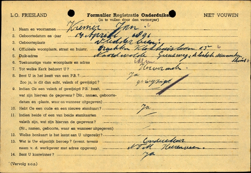 Duikadres: Grensweg, Noordwolde - Oorspronkelijk adres: Klokhuislaan 13, Drachten - Reden onderduik: anderszins - Overige opmerkingen: Bijzondere opmerkingen: Op last van hoogere hand ondergedoken. - De laatste drie weken thuis ondergedoken.