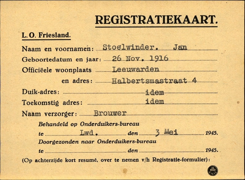 Onderduikregistratie van Jan Stoelwinder