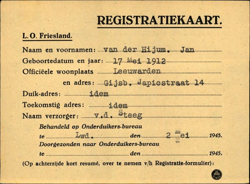 Duikadres: Gysbert Japicxstraat 14, Leeuwarden - Oorspronkelijk adres: Gysbert Japicxstraat 14, Leeuwarden - Reden onderduik: arbeidsinzet - Overige opmerkingen: Achterkant bijzonderheden: Achternaam onderduiker bevat 2 voorvoegsels maar volgens allefriezen.nl betreft het hier Jan van Hijum, dus met 1 voorvoegsel. - - ondergeoken wegens werk in Duitschland - Achterkant beroep: Werkman - Achterkant naam werkgever: -