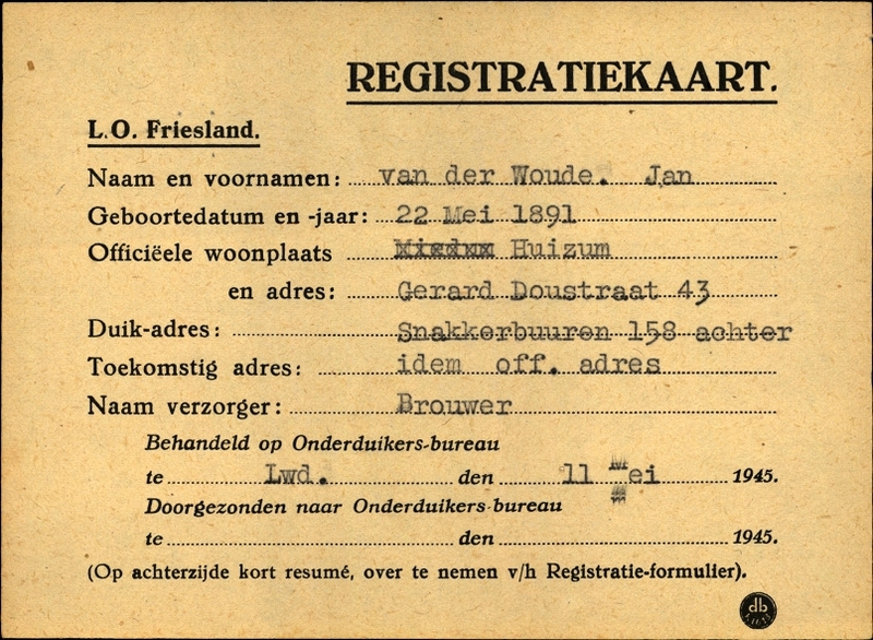Duikadres: 158 achter, Snakkerburen - Oorspronkelijk adres: Gerard Doustraat 43, Huizum - Reden onderduik: staking - Overige opmerkingen: Achterkant beroep: Conducteur - Achterkant naam werkgever: N.S.