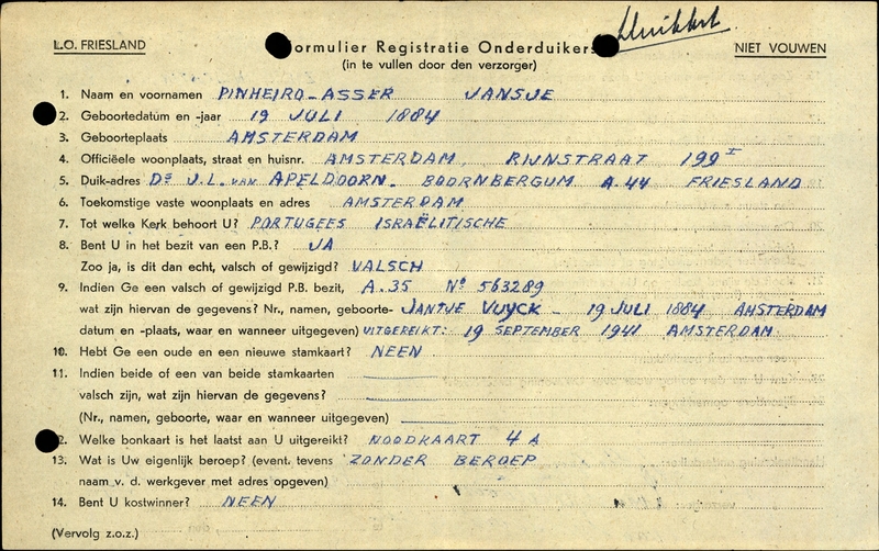 Duikadres: A 44, Boornbergum - Oorspronkelijk adres: Rijnstraat 199 I, Amsterdam - Reden onderduik: jodenvervolging - Overige opmerkingen: Bijzondere opmerkingen: Echtgenoot A.Pinheiro zat ook ondergedoken