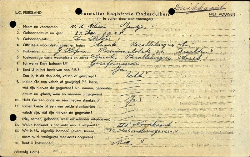 Onderduikinschrijving van Jantje v.d. Weide