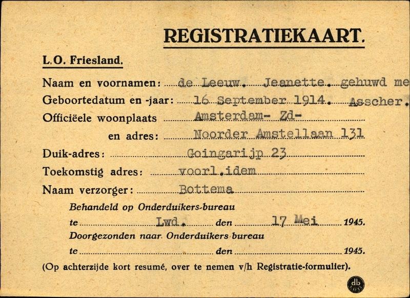 Duikadres: 23, Goingarijp - Oorspronkelijk adres: Noorder Amstellaan 131, Amsterdam-Zuid - Reden onderduik: jodenvervolging - Overige opmerkingen: Achterkant bijzonderheden: gehuwd met Asscher. - geen stkrt. - Achterkant beroep: huisvrouw