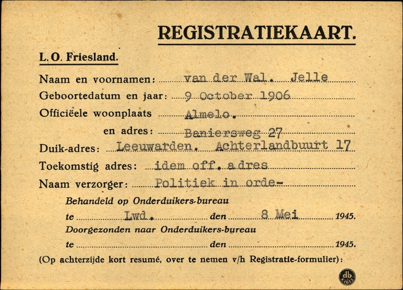 Duikadres: Landbuurt 17, Leeuwarden - Oorspronkelijk adres: Baniersweg 27, Almelo - Reden onderduik: anderszins - Overige opmerkingen: Achterkant bijzonderheden: ondergedoken wegens vlucht uit Dtsl. Was opgepikt bij razzia, doorgestuurd naar Dtsl., toen gevlucht. - Achterkant beroep: controleur Centrale Controledienst