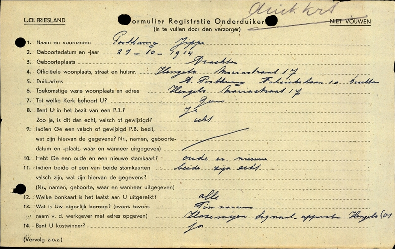 Duikadres: Fabriekslaan 10, Drachten - Oorspronkelijk adres: Mariastraat 17, Hengelo - Reden onderduik: arbeidsinzet