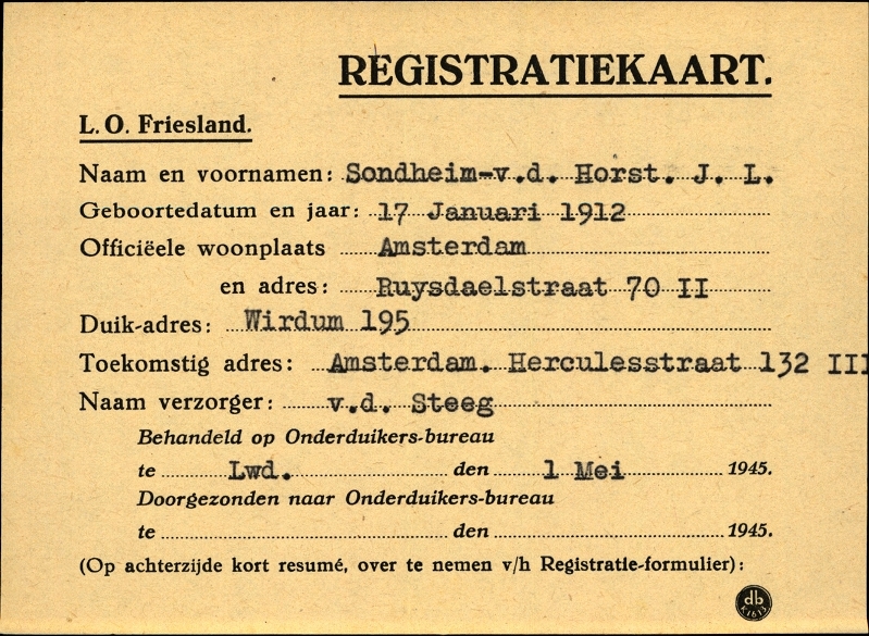 Duikadres: 195, Wirdum - Oorspronkelijk adres: Ruysdaelstraat 70 II, Amsterdam - Reden onderduik: jodenvervolging