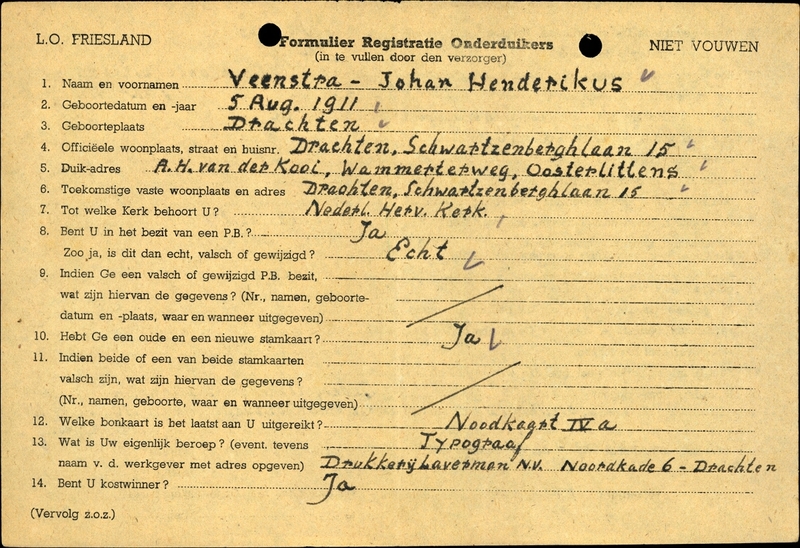 Onderduikinschrijving van Johan Henderikus Veenstra