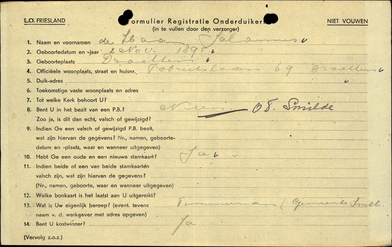 - Oorspronkelijk adres: Fabriekslaan 69, Drachten - Reden onderduik: arbeidsinzet - Overige opmerkingen: Bijzondere opmerkingen: OT Smilde