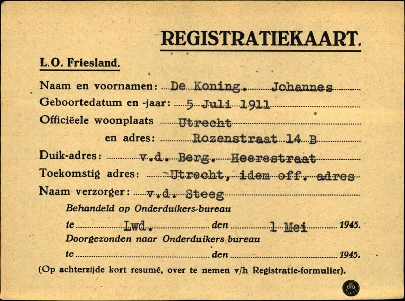 Duikadres: Heerestraat, Leeuwarden - Oorspronkelijk adres: Rozenstraat 14 B, Utrecht - Reden onderduik: arbeidsinzet - Overige opmerkingen: Achterkant bijzonderheden: geen stkrt. - Achterkant beroep: Artist - Achterkant naam werkgever: -