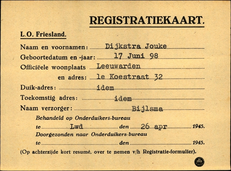 Duikadres: 1e Koestraat 32, Leeuwarden - Oorspronkelijk adres: 1e Koestraat 32, Leeuwarden - Reden onderduik: arbeidsinzet - Overige opmerkingen: Achterkant beroep: magazijnbediende