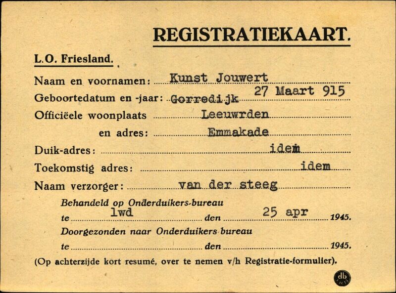 Duikadres: Emmakade, Leeuwarden - Oorspronkelijk adres: Emmakade, Leeuwarden - Reden onderduik: arbeidsinzet - Overige opmerkingen: Achterkant bijzonderheden: geen papieren - Achterkant beroep: monteur