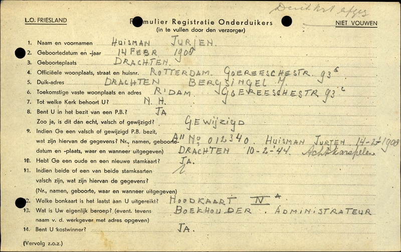 Duikadres: Berglaan 7, Drachten - Oorspronkelijk adres: Goereesestraat 93 c, Rotterdam - Reden onderduik: arbeidsinzet