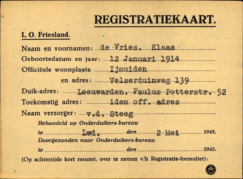 Duikadres: Paulus Potterstraat 52, Leeuwarden - Oorspronkelijk adres: Velserduinweg 139, IJmuiden - Reden onderduik: arbeidsinzet - Overige opmerkingen: Achterkant beroep: metaalbewerker