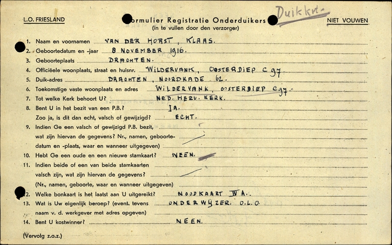 Onderduikinschrijving van Klaas van der Horst