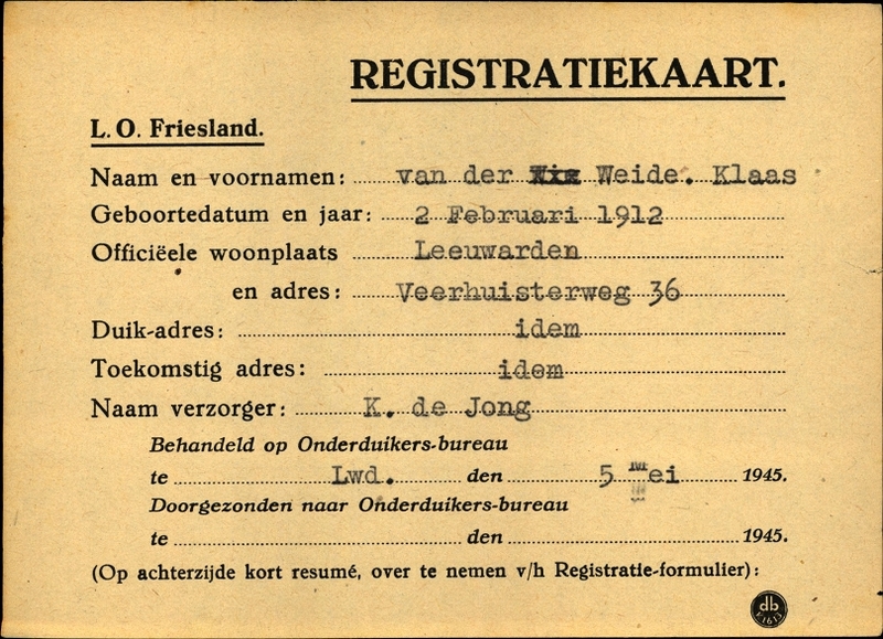 Duikadres: Vierhuisterweg 36, Leeuwarden - Oorspronkelijk adres: Vierhuisterweg 36, Leeuwarden - Reden onderduik: arbeidsinzet - Overige opmerkingen: Achterkant bijzonderheden: Toekomstig adres: Veerhuisterweg 36 Leeuwarden. - Alleen nwe. stkrt. - Achterkant beroep: Steenhouwer