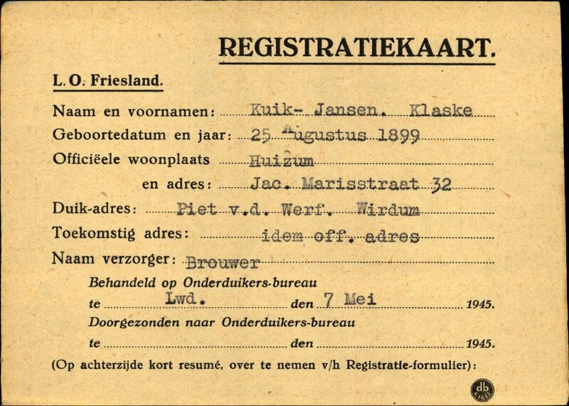 Duikadres: Wirdum - Oorspronkelijk adres: Jacob Marisstraat 32, Huizum - Reden onderduik: staking - Overige opmerkingen: Achterkant bijzonderheden: Naam: Kuik-Jansen - Duik-adres: Piet v.d. Werf ondergedoken wegens spoorwegstaking Bureau Lwd 7 mei 1945. Goede stkrt. - Achterkant beroep: - - Achterkant naam werkgever: -