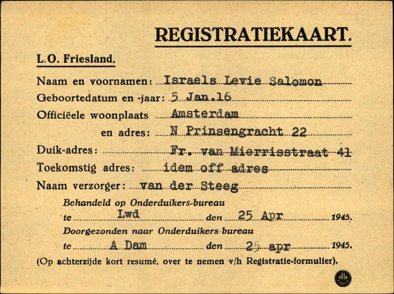 Duikadres: Frans van Mierisstraat 41, Leeuwarden - Oorspronkelijk adres: Nieuwe Prinsengracht 22, Amsterdam - Reden onderduik: jodenvervolging - Overige opmerkingen: Achterkant bijzonderheden: Werkzaam geweest als godsdienst onderwijzer. - Ondergedoken vanwege Jodenvervolging. - Valse papieren. - Achterkant beroep: Godsdienst onderwijzer - Achterkant naam werkgever: -