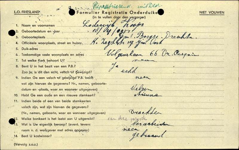 - Oorspronkelijk adres: K. Zegelstraat 17, IJmuiden - Reden onderduik: anderszins - Overige opmerkingen: Bijzondere opmerkingen: Gerepatrieerd uit Duitsland. Het huis is afgebroken.