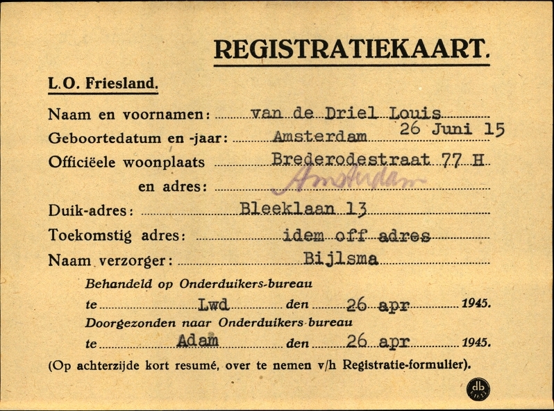 Duikadres: Bleeklaan 13, - Oorspronkelijk adres: Brederodestraat 77 H, Amsterdam - Reden onderduik: arbeidsinzet - Overige opmerkingen: Achterkant bijzonderheden: Doorgezonden naar Onderduikers bureau te Adam den 26 apr 1945 - Achterkant beroep: werktuigbouwkundige