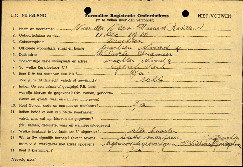 Onderduikinschrijving van Luwe Rindert van der Veen