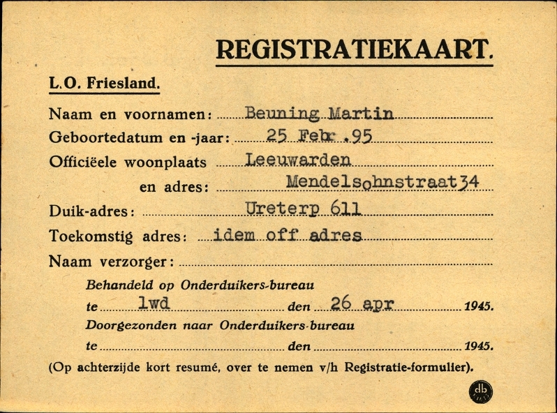 Duikadres: 611, Ureterp - Oorspronkelijk adres: Mendelssohnstraat 34, Leeuwarden - Reden onderduik: illegaal werk - Overige opmerkingen: Achterkant bijzonderheden: Toekomstig adres: idem off adres (Leeuwarden, Mendelssohnstraat 34) - - Behandeld op Onderduikers-bureau te lwd den 26 apr 1945. - Achterkant beroep: - - Achterkant naam werkgever: -