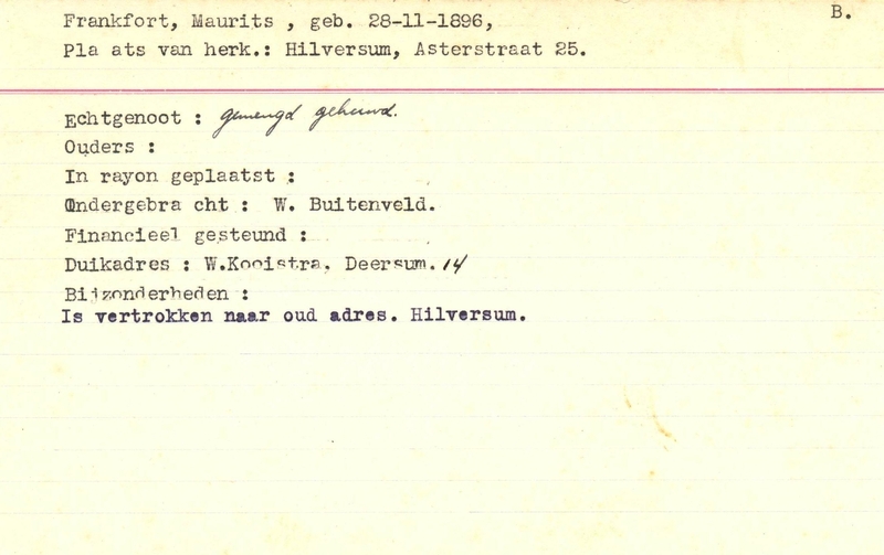 Duikadres: 14, Deersum - Oorspronkelijk adres: Asterstraat 25, Hilversum - Overige opmerkingen: Bijzonderheden: Is vertrokken naar oud adres. Hilversum.