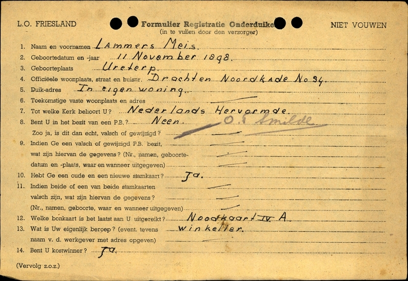 Duikadres: Noordkade 34, Drachten - Oorspronkelijk adres: Noordkade 34, Drachten - Reden onderduik: arbeidsinzet - Overige opmerkingen: Bijzondere opmerkingen: Genoemd wordt O.T. Smilde