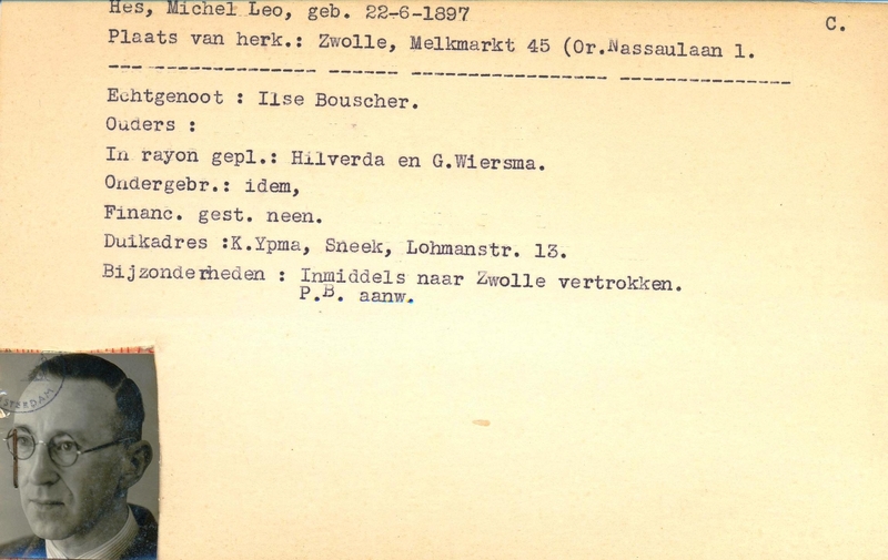 Duikadres: Lohmanstraat 13, Sneek - Oorspronkelijk adres: Melkmarkt 45 (Or. Nassaulaan 1), Zwolle - Overige opmerkingen: Bijzonderheden: Inmiddels naar Zwolle vertrokken. P.B. aanw. - - In rayon gepl.: Hilverda en G. Wiersma Ondergebr.: idem, - Financ. gest. neen. - Foto: Aanwezig.