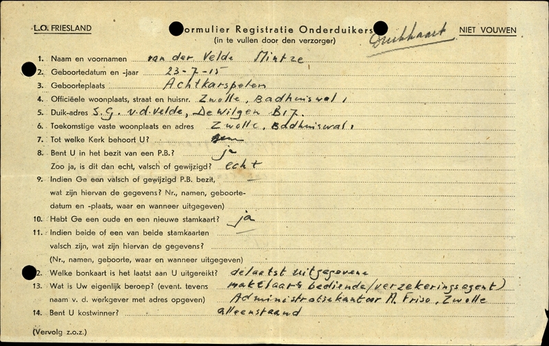Onderduikinschrijving van Mintze van der Velde