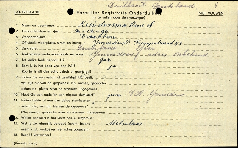 Onderduikinschrijving van Oene S. Reindersma