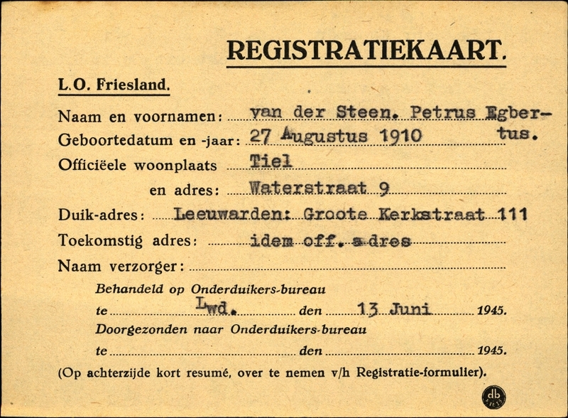 Onderduikinschrijving van Petrus Egbertus van der Steen