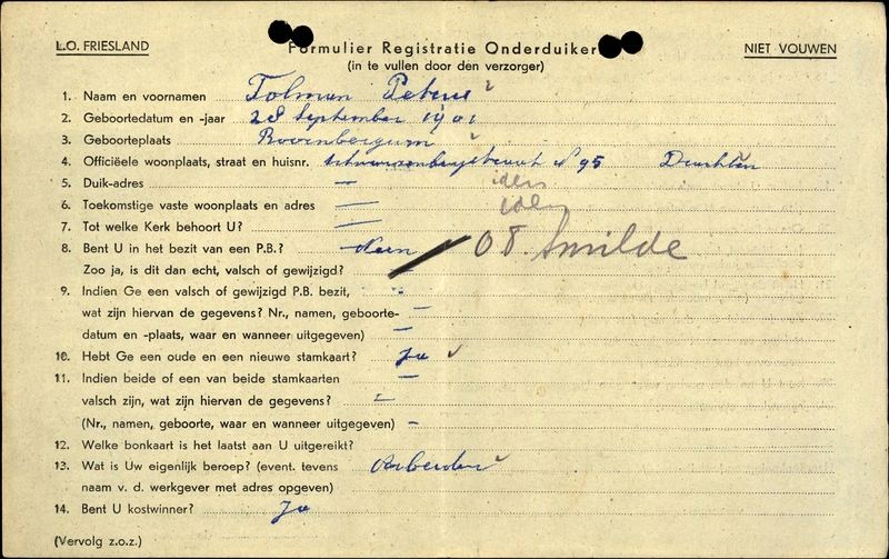 Onderduikinschrijving van Petrus Tolman