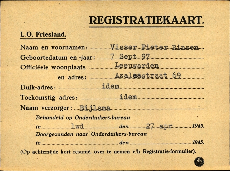 Duikadres: Azaleastraat 69, Leeuwarden - Oorspronkelijk adres: Azaleastraat 69, Leeuwarden - Reden onderduik: arbeidsinzet - Overige opmerkingen: Achterkant beroep: tuinman