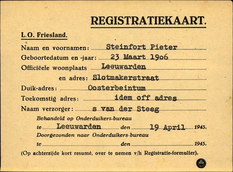Duikadres: Oosterbeintum, Hogebeintum - Oorspronkelijk adres: Slotmakersstraat, Leeuwarden - Reden onderduik: staking - Overige opmerkingen: Achterkant beroep: Werkzaam bij NS - Achterkant naam werkgever: NS