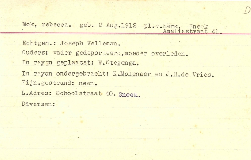 Duikadres: Schoolstraat 40, Sneek - Oorspronkelijk adres: Amaliastraat 41, Sneek - Overige opmerkingen: Bijzonderheden: vader gedeporteerd,moeder overleden
