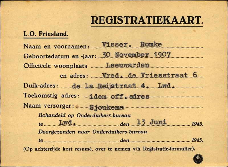 Duikadres: De la Reystraat 4, Leeuwarden - Oorspronkelijk adres: Vredeman de Vriesstraat 6, Leeuwarden - Reden onderduik: staking - Overige opmerkingen: Achterkant beroep: arbeider - Achterkant naam werkgever: N.S.